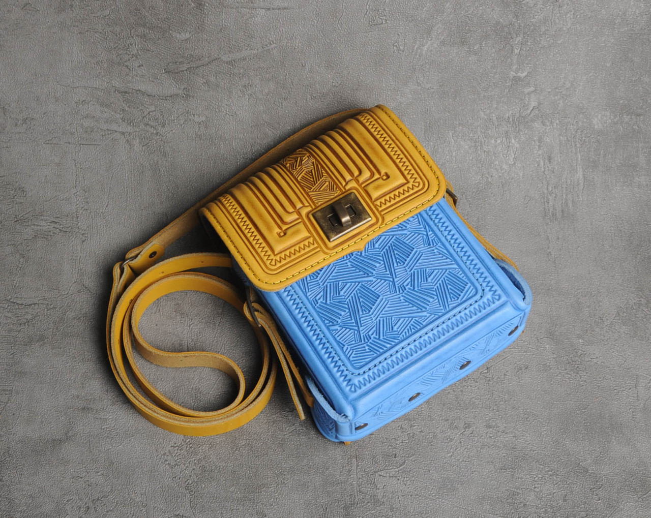 Шкіряна сумка жовто-блакитного кольору ручної роботи з тисненням “Ескіз”, 18×13×6 см