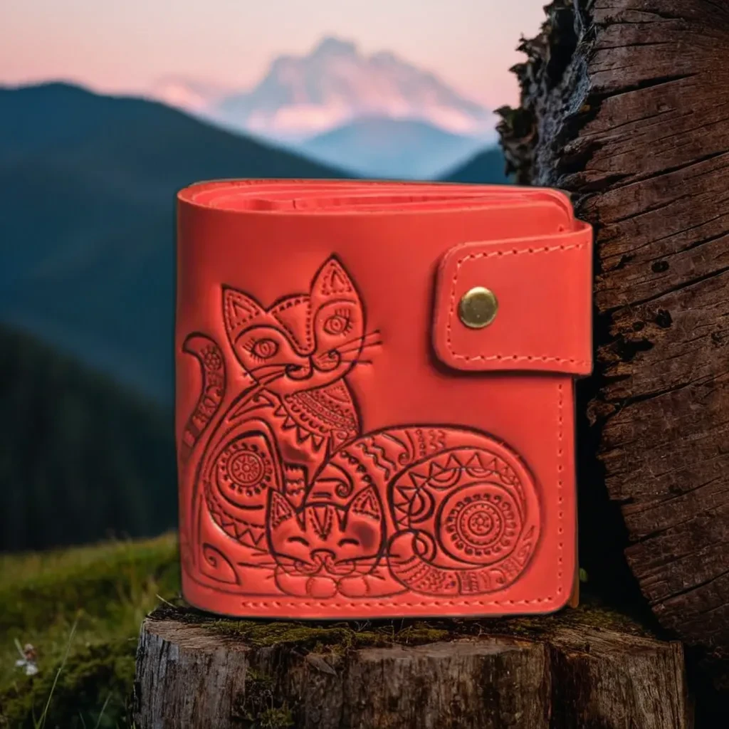 Дамський гаманець з натуральної шкіри ручної роботи з орнаментом "Котики" червоний